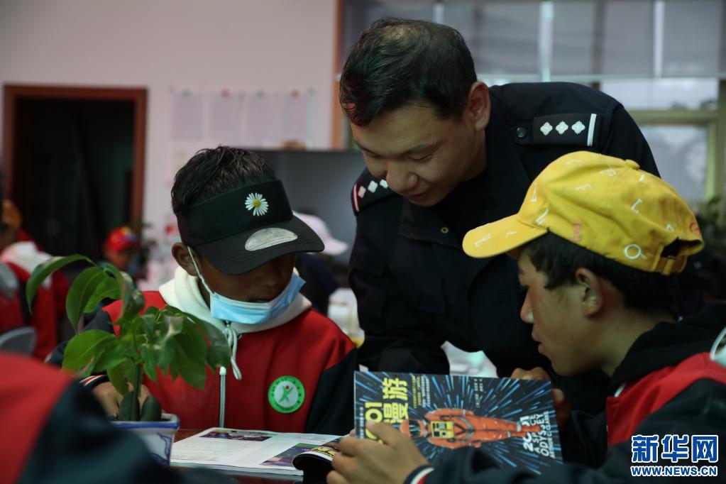 亞東出入境邊防檢查站圖書室對駐地中學(xué)學(xué)生開放,民警為學(xué)生講解書本知識(shí)(張雨強(qiáng)攝,新華社發(fā))