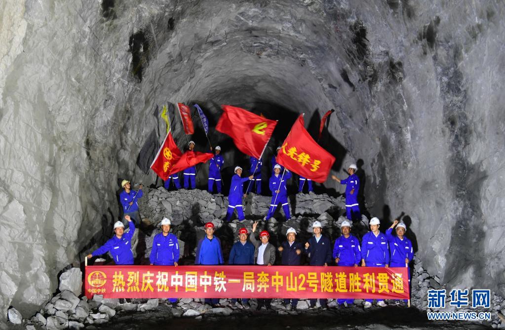 施工人員慶祝川藏鐵路拉林段重難點(diǎn)工程奔中山二號隧道順利貫通(2018年8月21日攝)。新華社記者 晉美多吉 攝