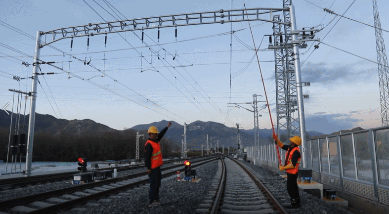 此次接觸網(wǎng)受電,由協(xié)榮站、扎囊站、山南站依次往林芝車站進(jìn)行,全線共有11座變電所、23個(gè)供電臂,整個(gè)受電過程歷經(jīng)1小時(shí)29分。