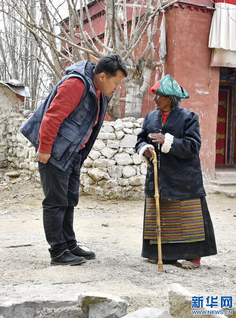 拉確老人(右)和來(lái)走訪的鄉(xiāng)干部嘮家常(4月16日攝)。新華社記者 張汝鋒 攝