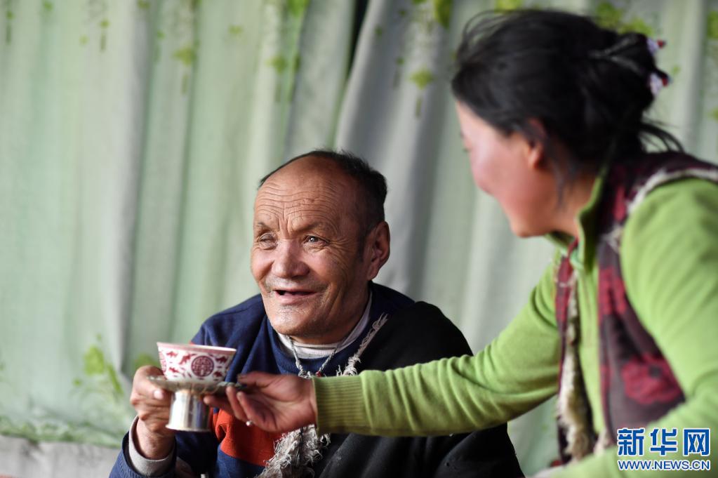親屬在給央多老人(左)敬茶(4月15日攝)。新華社記者 覺(jué)果 攝