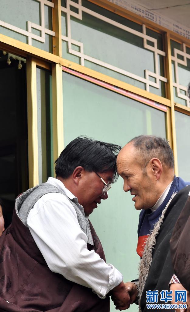 央多老人(右)在和看望他的村干部行碰頭禮(4月15日攝)。新華社記者 覺(jué)果 攝