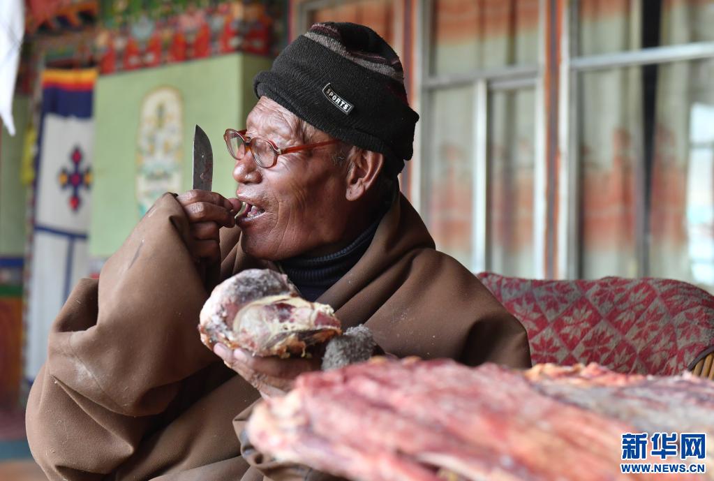 索朗多杰在吃牦牛肉(4月15日攝)。新華社記者 孫瑞博 攝