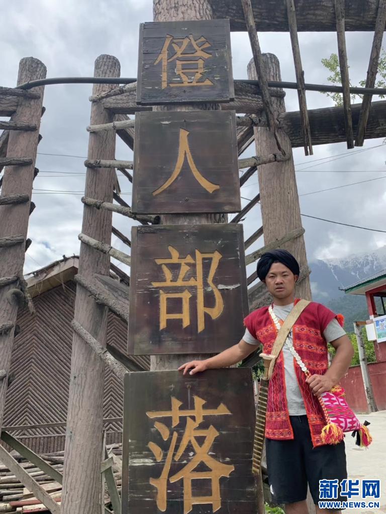 迪龍身著僜人傳統(tǒng)服飾站在村莊門口。 新華社發(fā)