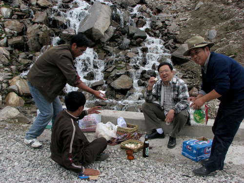 鐘揚(yáng)(右二)與西藏大學(xué)師生在西藏采集種子時(shí)在野外用餐。(資料照片)