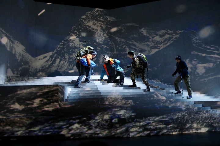 舞臺(tái)上,話(huà)劇《種子天堂》劇情進(jìn)入最高潮——在缺氧、強(qiáng)風(fēng)惡劣環(huán)境下,鐘揚(yáng)拼盡氣力來(lái)到海拔6000米的高度。當(dāng)他終于在一堆雜草和冰雪中發(fā)現(xiàn)那株頑強(qiáng)的雪蓮時(shí),就像父親看到自己剛出生的嬰兒,臉上掛著深深的喜悅,凝望良久……
