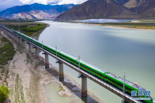 試運行的復(fù)興號列車行駛在雅魯藏布江上(6月16日攝,無人機照片)。新華社記者 普布扎西 攝