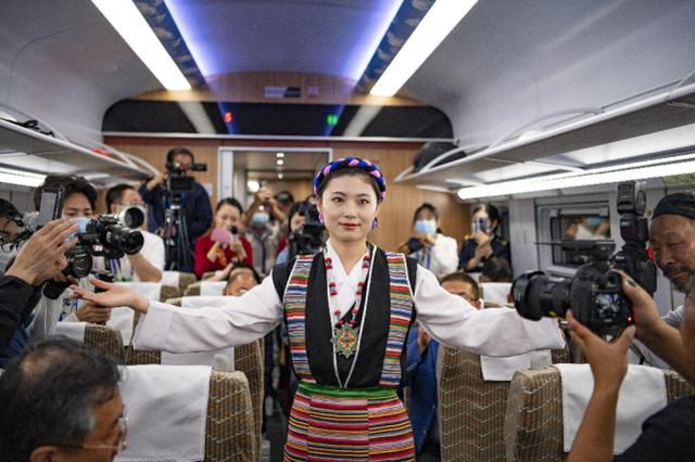 西藏首列復(fù)興號的列車員在進(jìn)行當(dāng)?shù)胤棻硌?6月25日攝)。 新華社記者 普布扎西 攝