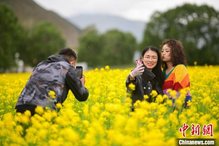 圖為游客在油菜花海里拍照留念。貢嘎來松 攝
