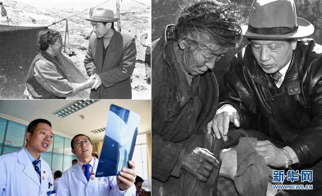 這是一張拼版照片:左上圖為來自陜西的援藏干部、阿里日土縣副縣長(zhǎng)賈冗勇深入牧區(qū),幫助藏族牧民解決生產(chǎn)、生活的實(shí)際困難(新華社記者土登攝,1997年11月11日發(fā));左下圖為2017年8月3日,北京積水潭醫(yī)院援藏醫(yī)生龔曉峰(右)和北京天壇醫(yī)院援藏醫(yī)生李家謀在拉薩市人民醫(yī)院骨科病房?jī)?nèi)查看患者的X光片,進(jìn)行工作交接(新華社記者晉美多吉攝);右圖為孔繁森(右)在阿里日土縣過巴鄉(xiāng)為孤寡老人益西卓瑪治病(新華社記者土登攝,1994年12月26日發(fā))。新華社發(fā)