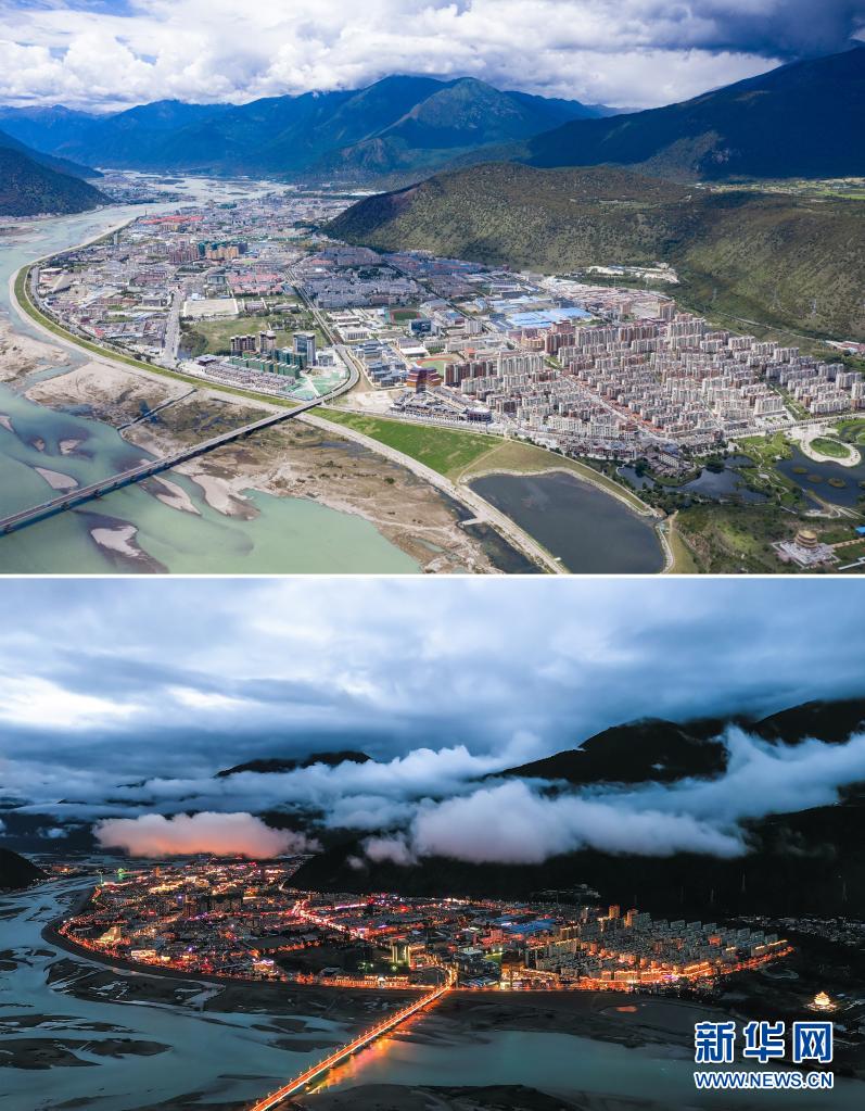 拼版照片:上圖7月19日拍攝的林芝市景色(無人機(jī)照片,新華社記者 普布扎西 攝);下圖為6月4日拍攝的林芝市夜景(無人機(jī)照片,新華社發(fā) 董志雄 攝)。