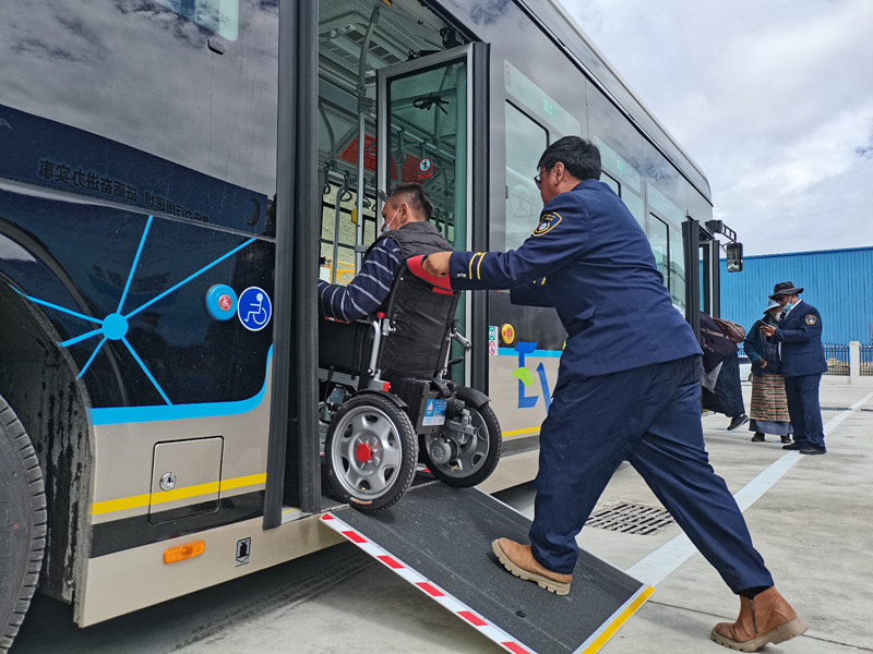 3日,拉薩市公交運(yùn)營有限公司舉行拉薩公交經(jīng)開區(qū)B區(qū)公交首末站啟用暨大站快線開通儀式?,F(xiàn)場,坐在輪椅上的市民覺列準(zhǔn)備乘坐新公交車,駕駛員接到乘車提示后,采取制動(dòng)措施,將車輛熄火后來到后門處,將無障礙踏板翻開并固定好,順利幫其上車。