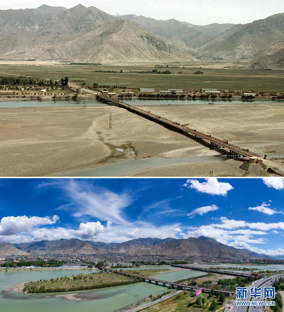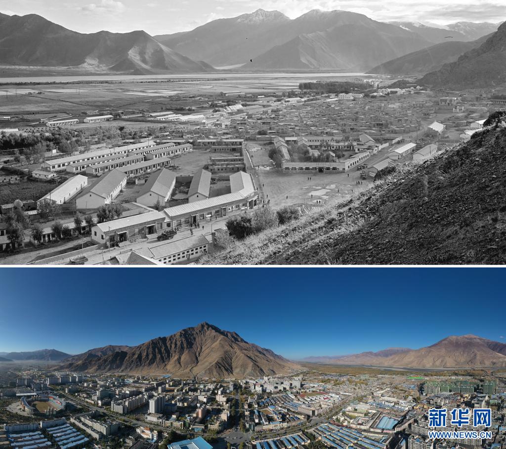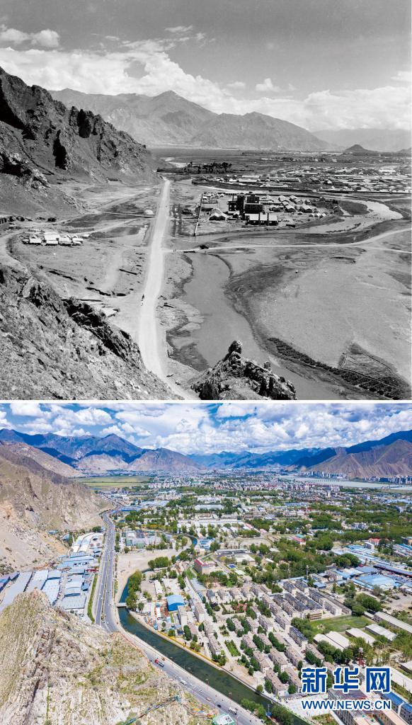 拼版照片:上圖是20世紀(jì)60年代拍攝的拉薩市西郊景象(新華社發(fā) 藍(lán)志貴攝);下圖是2021年8月9日拍攝的拉薩市西郊新貌(新華社記者普布扎西攝,無(wú)人機(jī)照片)。新華社發(fā)