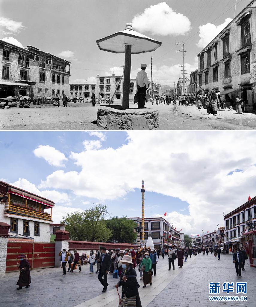拼版照片:上圖是20世紀(jì)50年代的拉薩市八廓街(新華社記者王純德攝);下圖是2021年8月13日拍攝的拉薩市八廓街(新華社記者覺果攝)。新華社發(fā)
