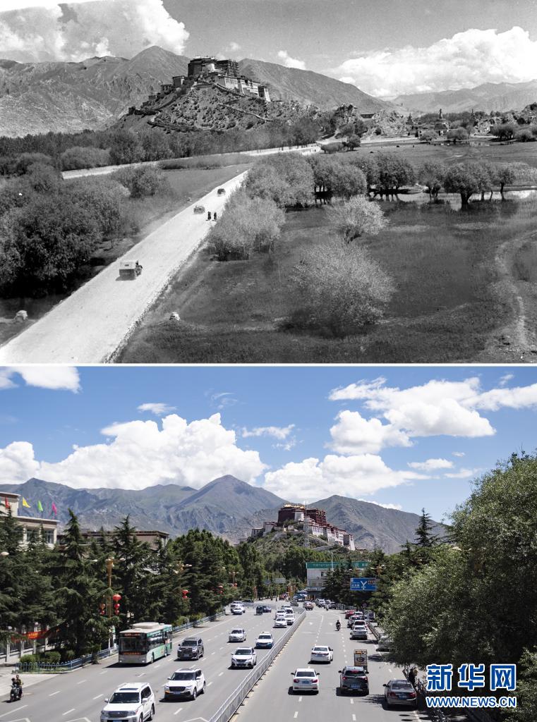 拼版照片:上圖是20世紀(jì)50年代,汽車通過(guò)市郊公路開往布達(dá)拉宮方向(新華社記者任用昭攝);下圖是2021年8月9日,車輛穿行在通往布達(dá)拉宮的大路上(新華社記者張汝鋒攝)。新華社發(fā)