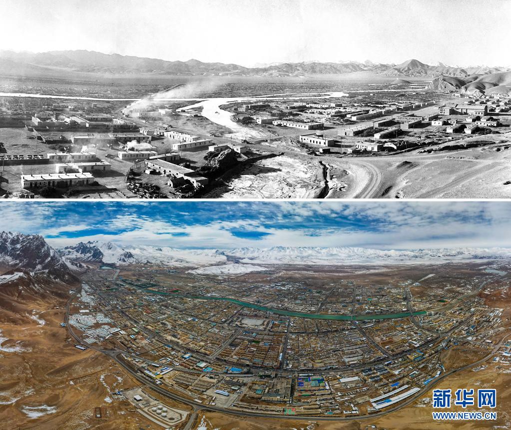 拼版照片:上圖是20世紀(jì)70年代的阿里獅泉河風(fēng)貌(新華社記者徐邦攝);下圖是2021年5月21日拍攝的阿里獅泉河鎮(zhèn)新貌(新華社記者孫瑞博攝,無(wú)人機(jī)全景照片)。新華社發(fā)