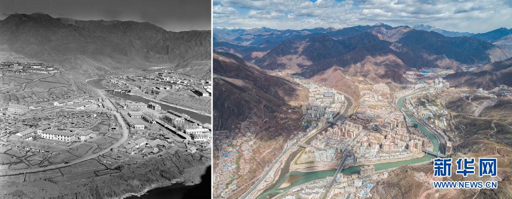 拼版照片:左圖是20世紀(jì)60年代的昌都市區(qū)一角(新華社記者任用昭攝);右圖是2021年3月25日拍攝的昌都市卡若區(qū)(新華社記者孫非攝,無(wú)人機(jī)照片)。新華社發(fā)