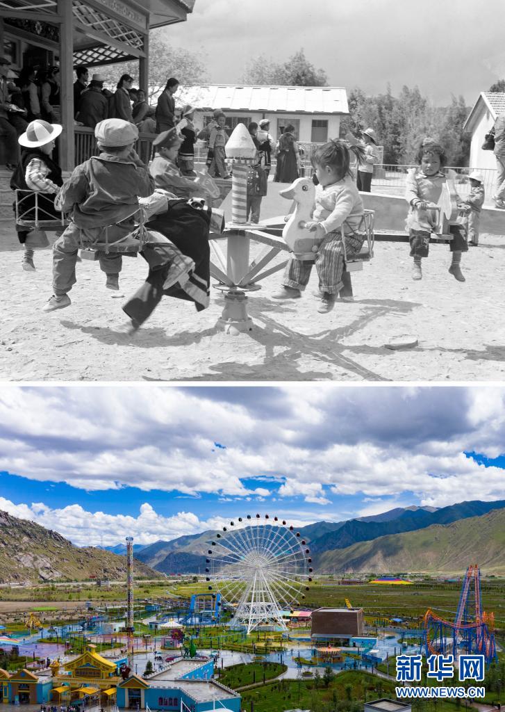 拼版照片:上圖是20世紀(jì)80年代,日喀則幼兒園的孩子們?cè)谕鎰?dòng)物圓盤轉(zhuǎn)椅(新華社記者程曦?cái)z);下圖是2021年8月9日拍攝的拉薩市象雄美朵游樂(lè)園(新華社記者張汝鋒攝,無(wú)人機(jī)照片)。新華社發(fā)