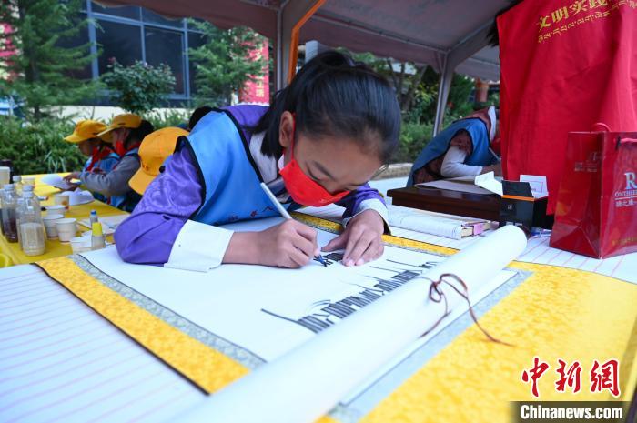 圖為學生在寫藏文書法?!≮w朗 攝