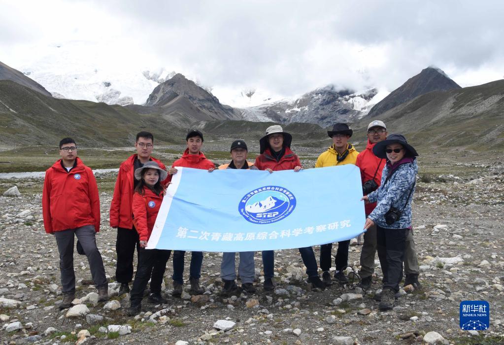 8月24日,在西藏日喀則市區(qū)域內(nèi)的喜馬拉雅山脈一處雪山下,中科院地理科學(xué)與資源研究所客座教授李渝生(中)和年輕隊員們合影?!⌒氯A社記者 杜剛 攝