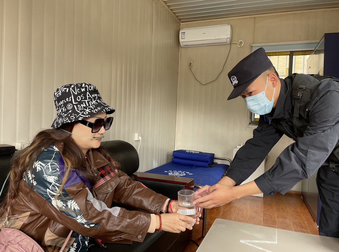 檢查站民警除了檢查出入邊境管理區(qū)人員和車輛以外,還設(shè)置了綠色便民服務(wù)區(qū),專門為長(zhǎng)途駕駛的游客提供飲用熱水和一些應(yīng)對(duì)高原反應(yīng)的藥品,以及為有吸氧需求的游客提供便攜式制氧機(jī)。據(jù)不完全統(tǒng)計(jì),自上點(diǎn)開(kāi)展工作兩年以來(lái),曲桑邊境檢查站共計(jì)為游客提供物資藥品幫助240余人次,幫助救援被困游客50余人,獲得了過(guò)往群眾游客的一致好評(píng)。