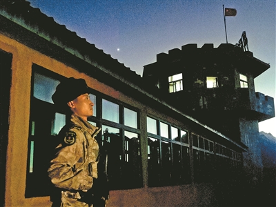 昆木加哨所中士唐海福在寒夜中站崗。徐文斌 攝