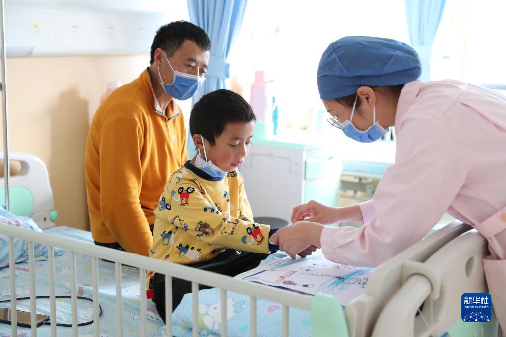 11月25日,在福建省兒童醫(yī)院病房,護(hù)士向康復(fù)中的先心病患兒索朗次珍表示鼓勵。新華社記者 姜克紅 攝