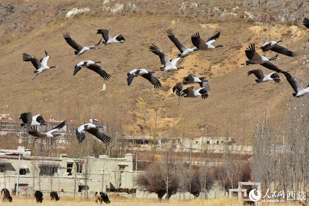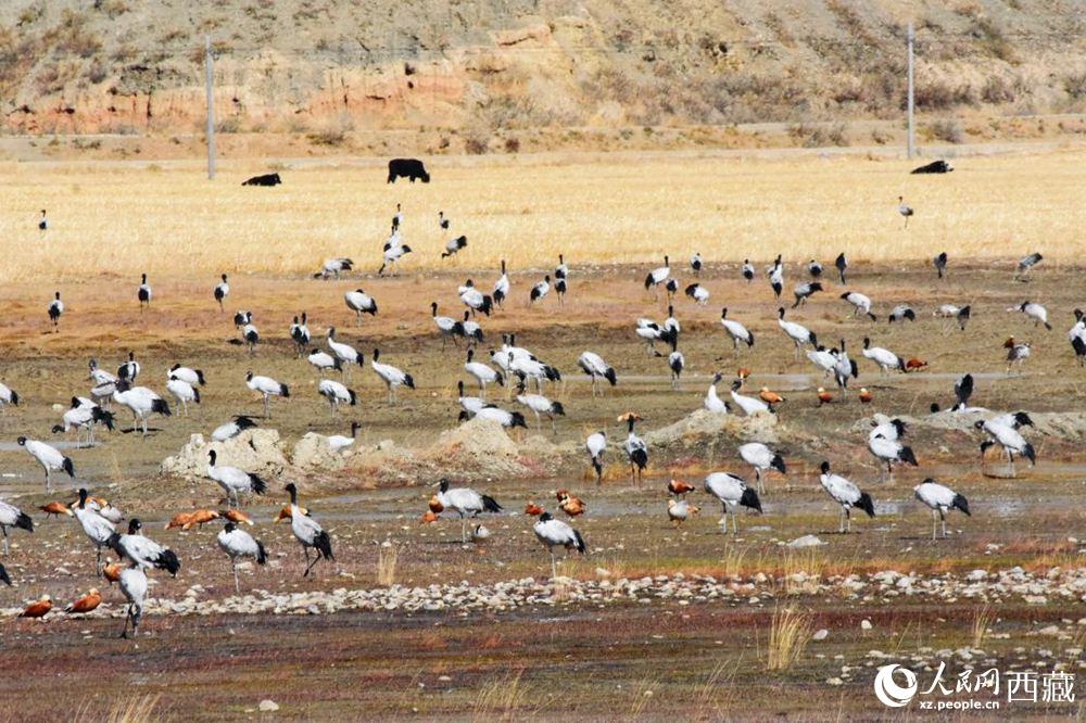 黑頸鶴在收割完的青稞地。人民網(wǎng) 李海霞 攝