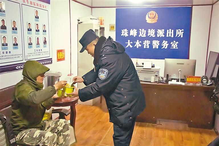 圖為西藏日喀則邊境管理支隊(duì)珠峰邊境派出所民警給被救游客提供食物。記者 張宇 通訊員 龍小鳳 攝