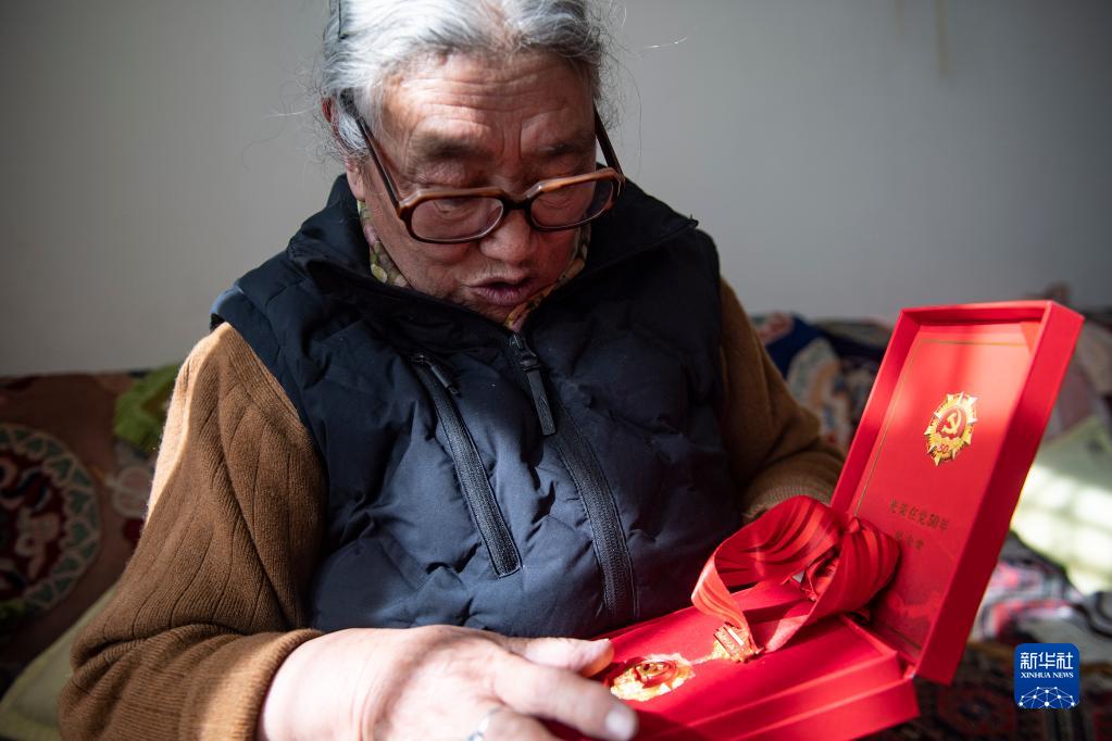 次仁卓瑪向記者展示光榮在黨50年紀(jì)念章(12月7日攝)。新華社記者 孫瑞博 攝