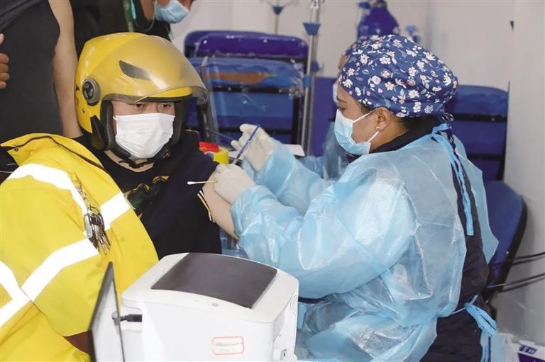 醫(yī)務(wù)人員為美團(tuán)外賣騎手接種第三針新冠疫苗。圖片來自拉薩工會微信公眾號