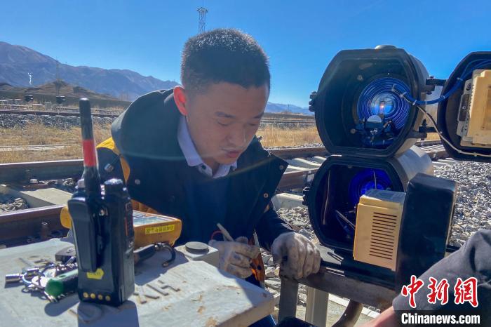 圖為劉興文在拉日鐵路測試信號機(jī)電燈電壓?!⊥鮼睚垺z
