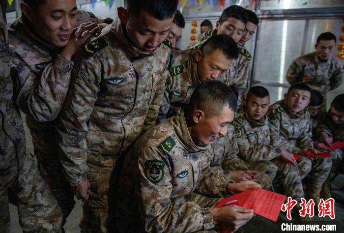 聯(lián)歡的尾聲指導(dǎo)員夏邦國拿著最后的彩袋走到臺前,把晚會推向高潮,“兄弟們,這還有一大袋紅包,里面裝著的可是最珍貴的祝福”。官兵們用抽盲盒的形式拆開新年的“紅包”。中士趙路寬抽到一個最鼓的,打開是滿滿的糖果;下士吳兵拆開的是一個帶有小機關(guān)的新年賀卡;下士鄧云川拆到一封遠(yuǎn)方的匿名信,“雖不曾相見與相識,但知道是你們在默默堅守付出,守衛(wèi)著祖國的雪域邊防”。伴隨著他磕絆的普通話,連隊官兵漸漸安靜下來?!斑呹P(guān)有我,請祖國和人民放心”,簡易投影的大屏上開始播放著官兵們一年多來頂風(fēng)冒雪,戰(zhàn)天斗地的光影片段,在這大山里的多少的苦累酸甜,都已經(jīng)鐫刻在茫茫雪域。