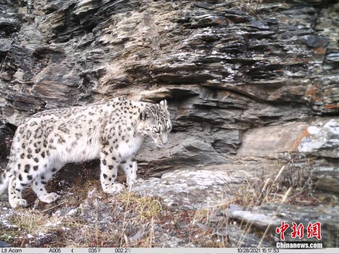 資料圖為2021年10月28日在西藏自治區(qū)丁青縣境內(nèi)由紅外相機拍攝到的雪豹活動影像。 中新社發(fā) 山水自然保護中心 供圖