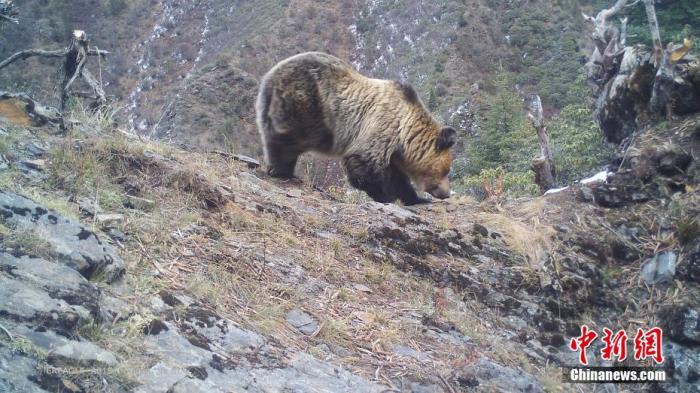 資料圖為2021年10月29日在西藏自治區(qū)丁青縣境內(nèi)由紅外相機拍攝到的棕熊活動影像。 中新社發(fā) 山水自然保護中心 供圖