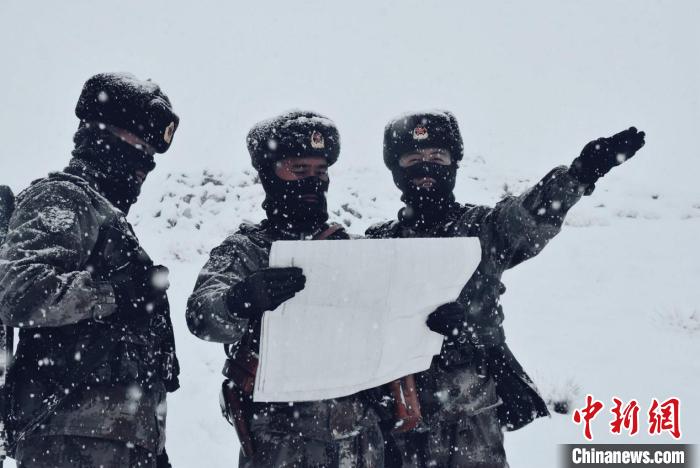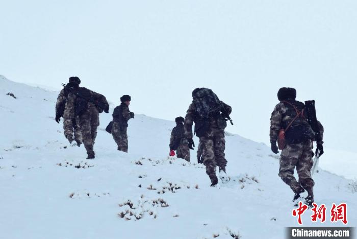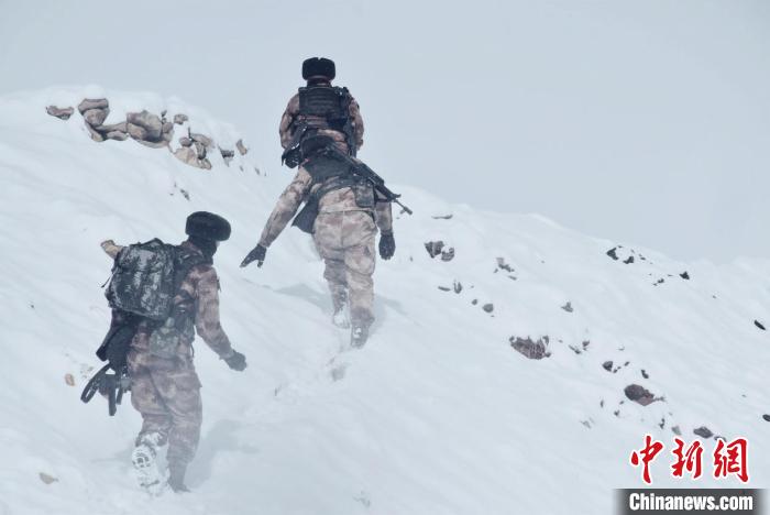 由于道路積雪較厚,車輛無法通行。官兵們采取徒步方式向點位前行,巡邏分隊在風(fēng)雪中艱難前行,隨著海拔的逐漸增加,氧氣愈發(fā)稀薄,此時的氣溫已經(jīng)接近零下30攝氏度。