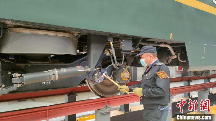 資料圖為嘎瑪達(dá)吉利用庫停時間對列車走形部進(jìn)行檢查。青藏集團(tuán)公司供圖