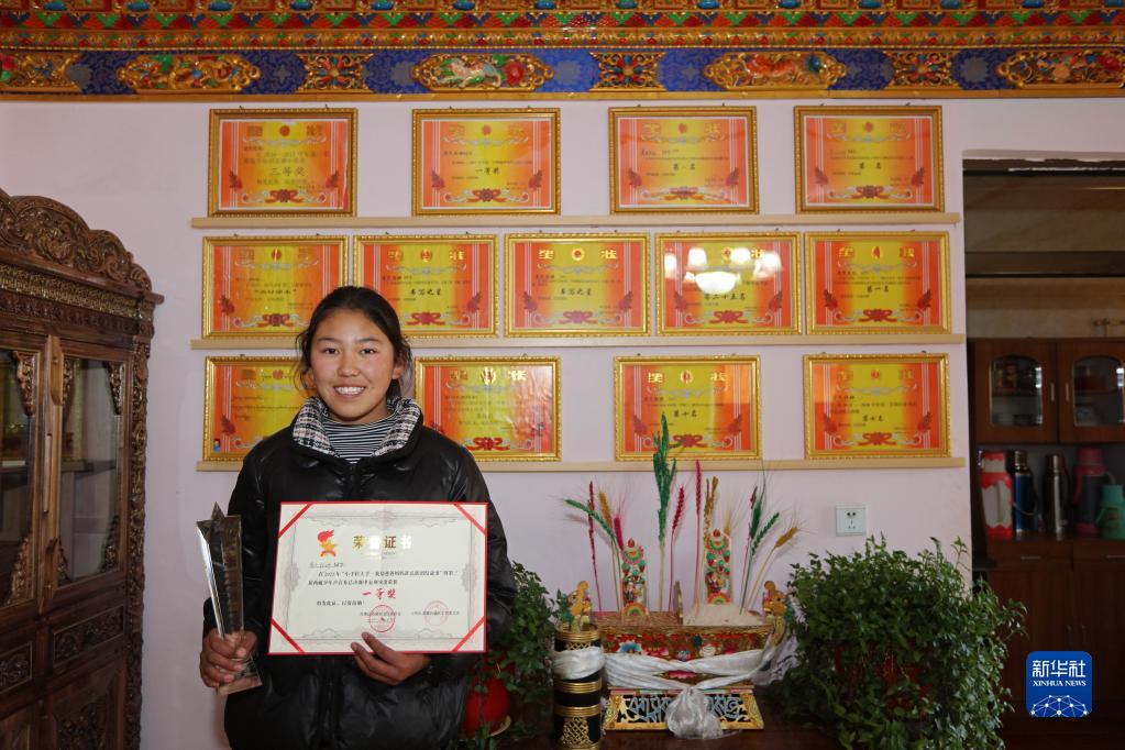 達(dá)瓦堅(jiān)參的女兒普巴拉姆展示自己的獎(jiǎng)狀(2022年2月23日攝)。新華社記者姜帆 攝