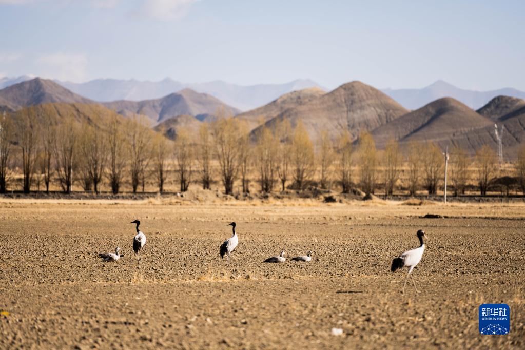 這是在西藏日喀則市桑珠孜區(qū)的農(nóng)田里拍攝的黑頸鶴(3月12日攝)。新華社記者 周荻瀟 攝