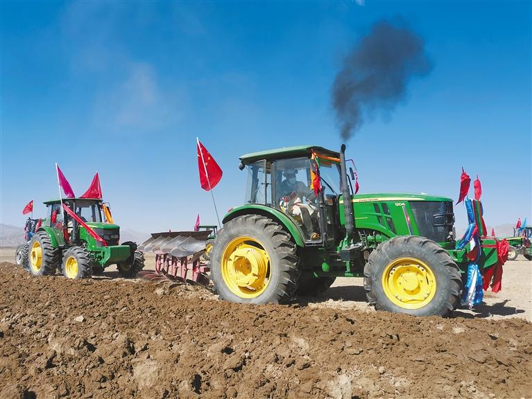 在桑珠孜區(qū)曲美鄉(xiāng)拉貴村春耕儀式上,村民用大型農(nóng)用機(jī)械開(kāi)耕犁地。記者 扎西頓珠 攝