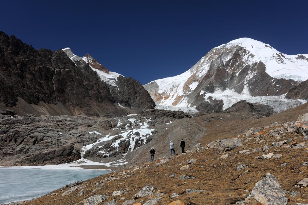 2022年3月27日,幾位探險者在遠眺窮母崗日峰腳下的冰川。(新華社記者 姜帆 攝)