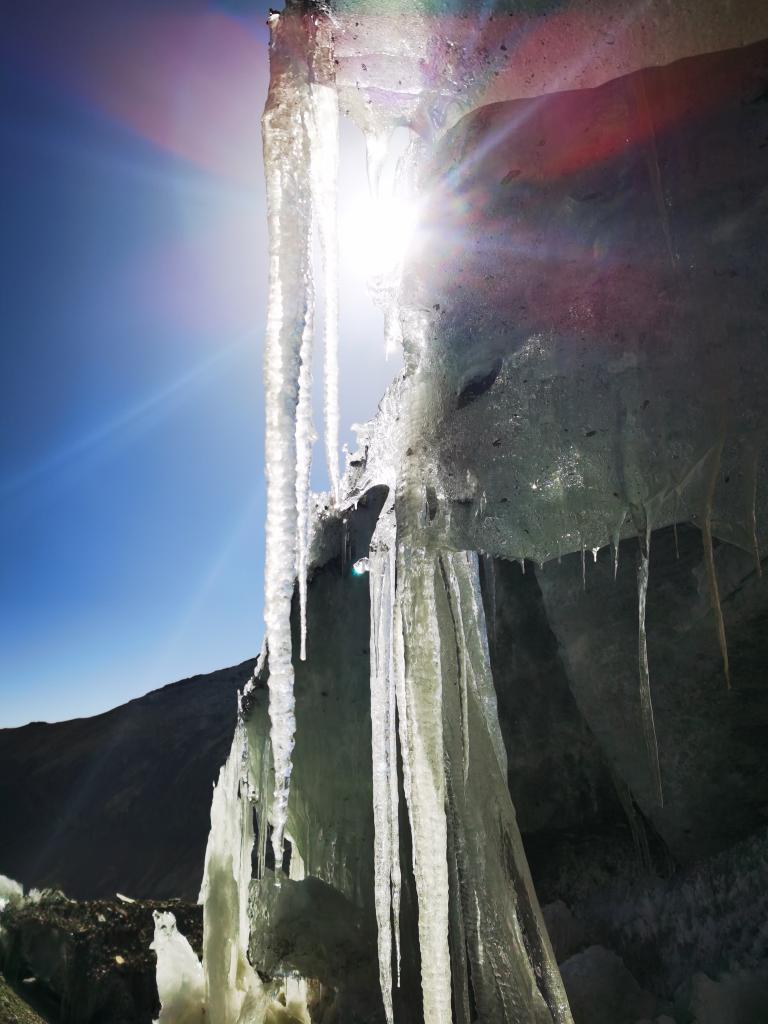 2022年3月27日拍攝的冰川融化形成的冰柱。(手機照片,新華社記者 沈虹冰 攝)