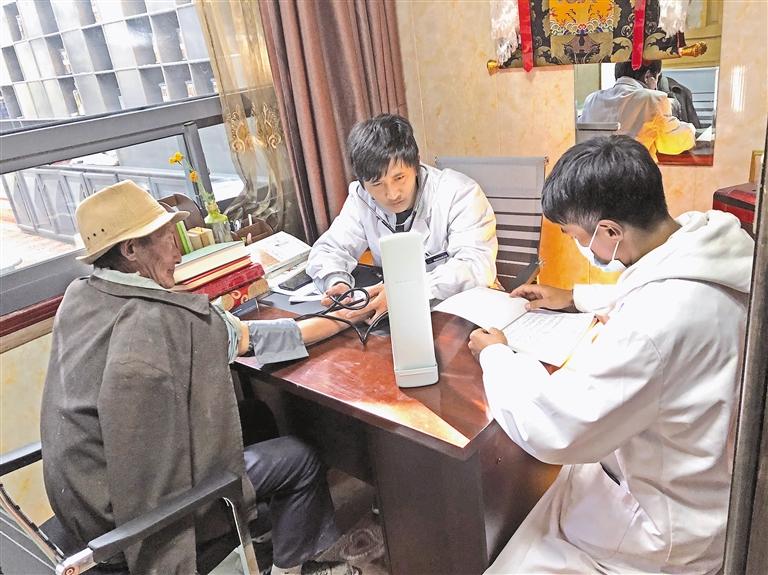 圖為林周縣朗邁社工協(xié)會的醫(yī)生為老人提供康療服務(wù)。記者 央金 攝