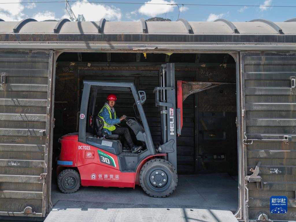 林芝市巴宜區(qū)布久鄉(xiāng)朵當村村民邊巴在林芝站貨場駕駛叉車(3月29日攝)。新華社記者 洛卓嘉措 攝