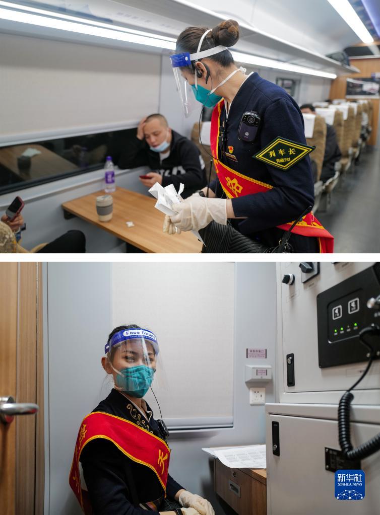 拼版照片:上圖為3月27日,劉文靜在列車上檢查衛(wèi)生;下圖為劉文靜在列車廣播室。C893次列車長劉文靜已經(jīng)在鐵路工作近十年,先后在青藏、拉日、拉林三條鐵路線任職,親身經(jīng)歷十年來西藏鐵路運輸?shù)木拮?。新華社記者 洛卓嘉措 攝