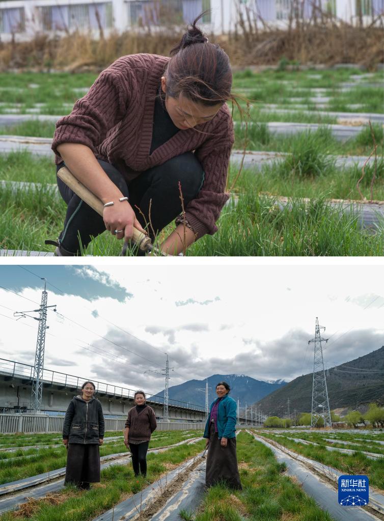 拼版照片:上圖為3月30日,尼瑪?shù)录谒{莓種植基地工作;下圖為尼瑪?shù)录ㄖ校┘巴抡驹谒{莓種植基地中,背后是鐵路橋。麥巴村村民尼瑪?shù)录衲陝倽M20歲,此前在林芝巴宜區(qū)一家藏餐館打工,后來回到村里設(shè)立的藍莓種植基地工作。尼瑪?shù)录f,能在家門口工作令她很開心,她每天都能看到火車從旁邊經(jīng)過,希望有一天也能坐上火車去拉薩逛一逛。新華社記者 洛卓嘉措 攝
