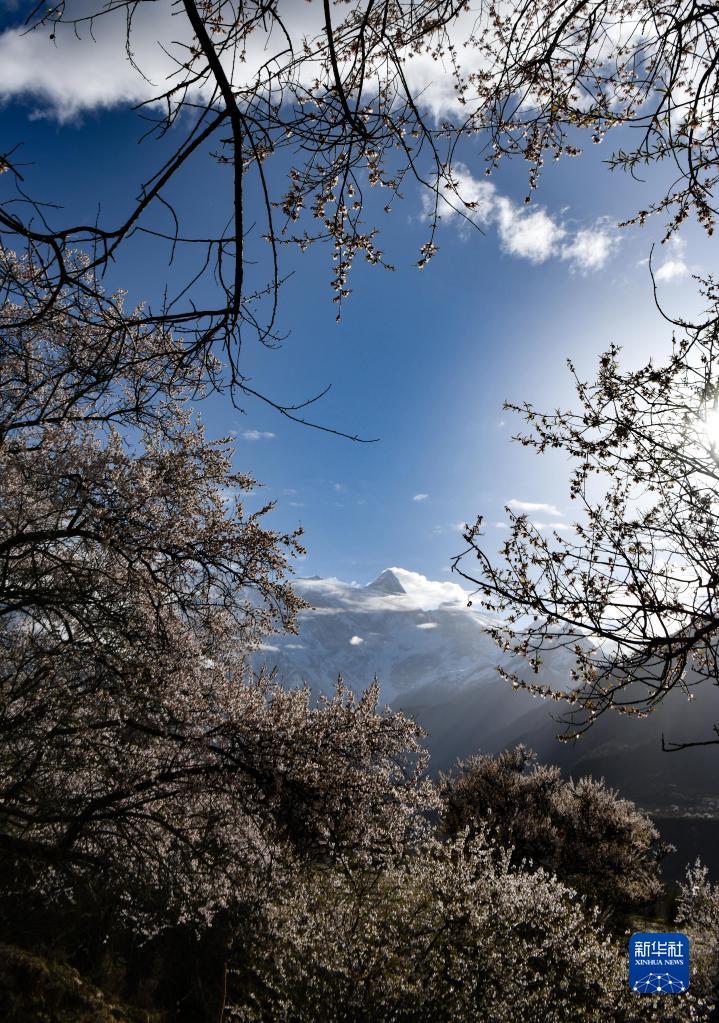 桃花掩映下的南迦巴瓦峰(4月13日攝)。新華社記者 孫非 攝