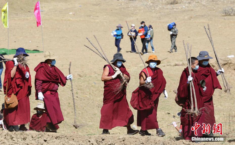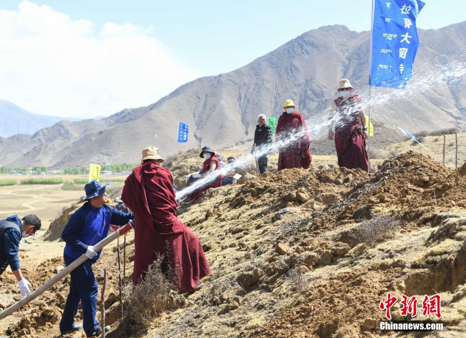 4月15日,西藏大昭寺僧人等在蔡公堂鄉(xiāng)植樹(shù)。當(dāng)日,西藏大昭寺在拉薩市城關(guān)區(qū)蔡公堂鄉(xiāng)啟動(dòng)拉薩南北山2800余畝山地綠化工程項(xiàng)目。 中新社記者 貢嘎來(lái)松 攝