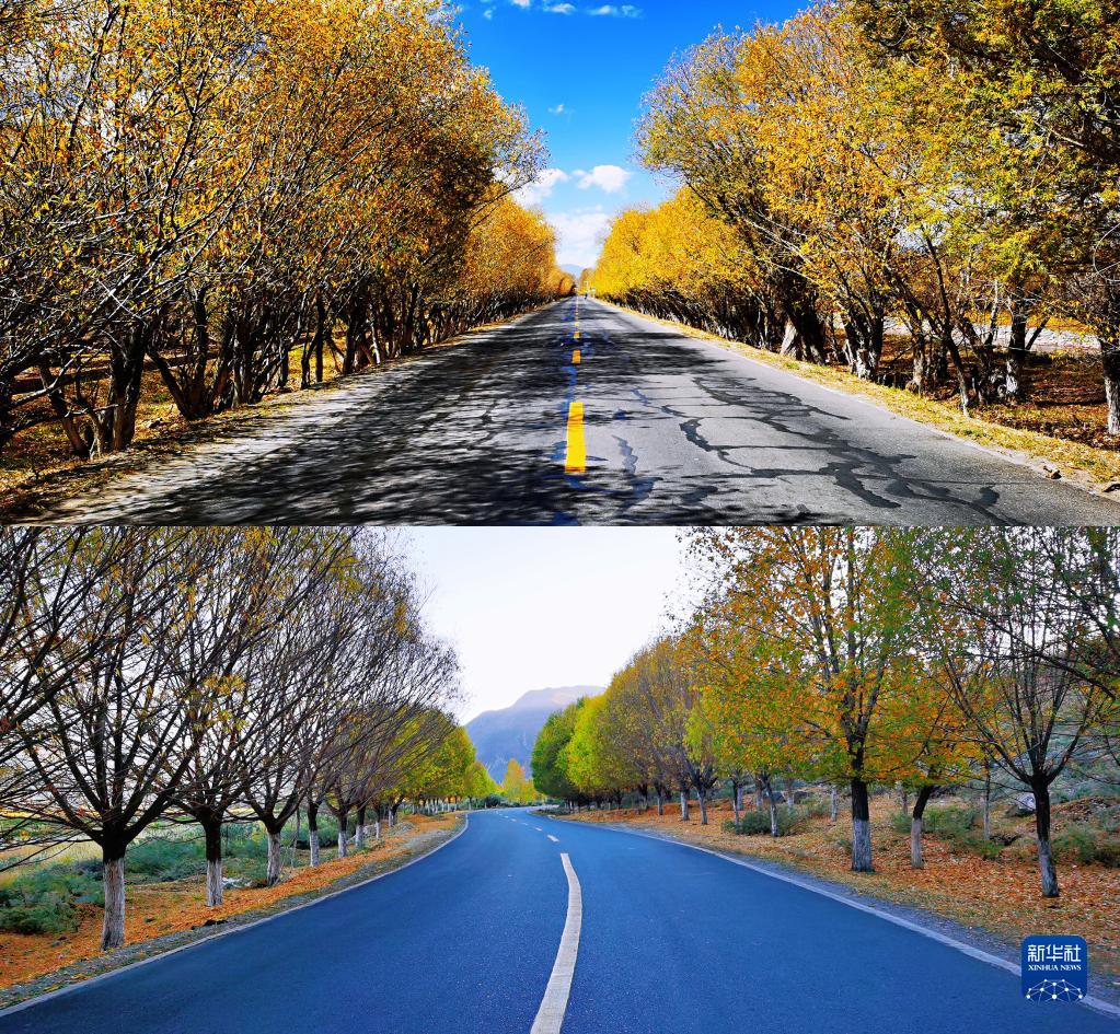 這是拉薩市林周縣的鄉(xiāng)村道路(手機(jī)拼版照片,2021年10月16日攝)。新華社記者 沈虹冰 攝