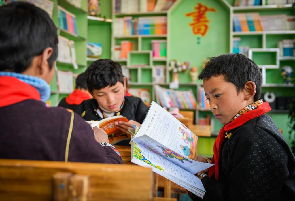 西藏林芝市工布江達縣仲莎鄉(xiāng)中心小學低年級學生在校圖書室內閱覽書籍(2018年4月攝)。新華社發(fā)